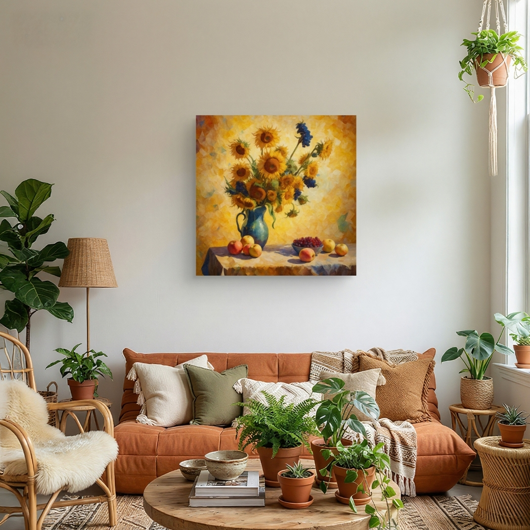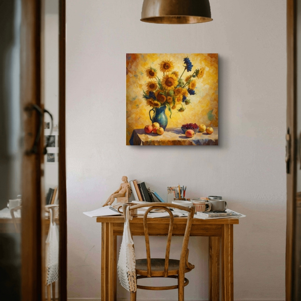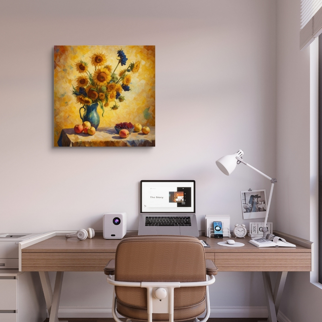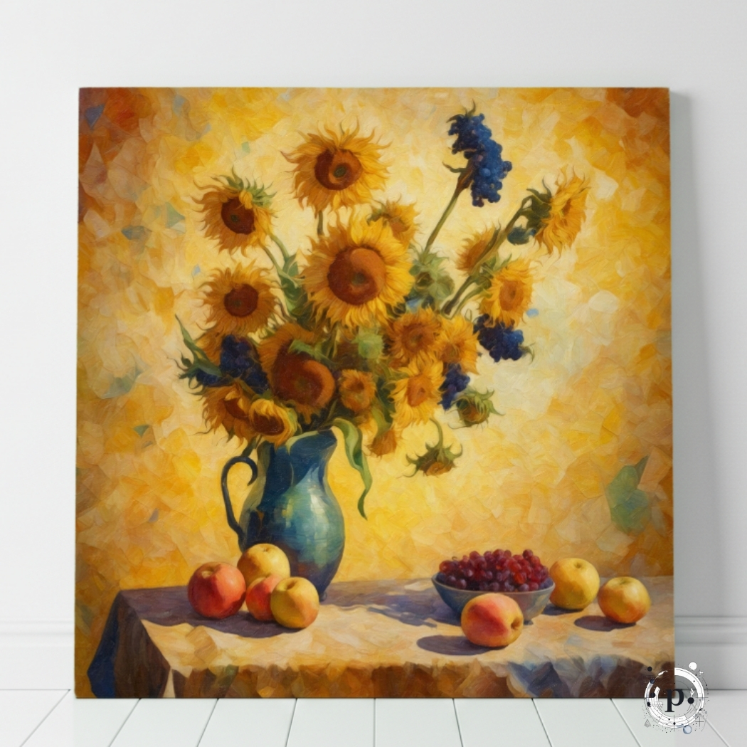 Discover the “Sunshine Abundance” inspired by Van Gogh, with a warm and lively atmosphere, is a a sunlit still life in a sunny and sunny day: Sunflowers, bunch of grapes, apples and peaches against a warm golden yellow background. This is the image of cultural fusion and is made in the spirit of joie de vivre, a abundance, and the richness of nature of nature.
