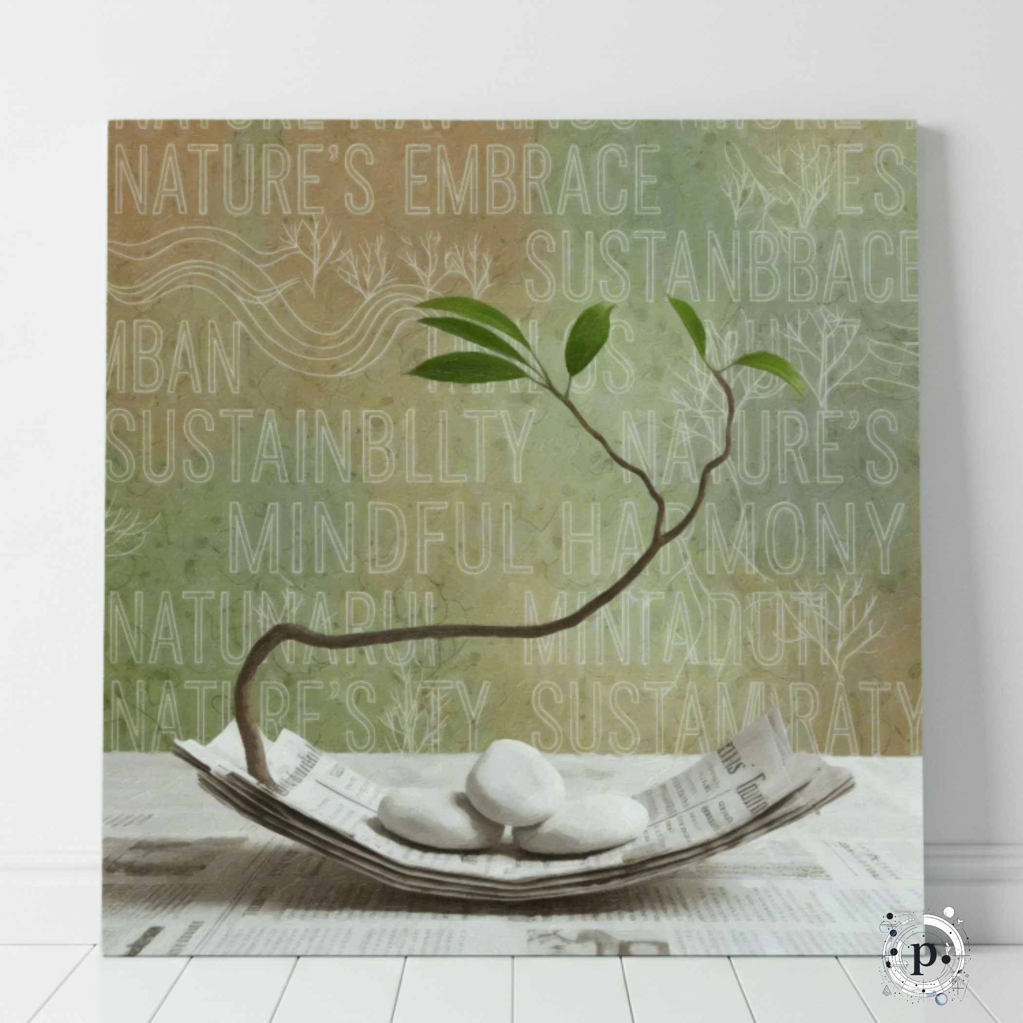 A „Harmónia” egy fiatal növény ágát ábrázolja, amely egy újságpapírból formált csónakban pihenő kövekkel együtt keresi egyensúlyát. A háttérben a természet, a fenntarthatóság és a belső béke kulcsszavakból álló kompozíció arra emlékeztet, hogy a mindennapi élet zűrzavarában is megtalálhatjuk a nyugalom pillanatait. A kép a keleti filozófia és a modern minimalizmus találkozása, amely a kulturális fúzió jegyében született.