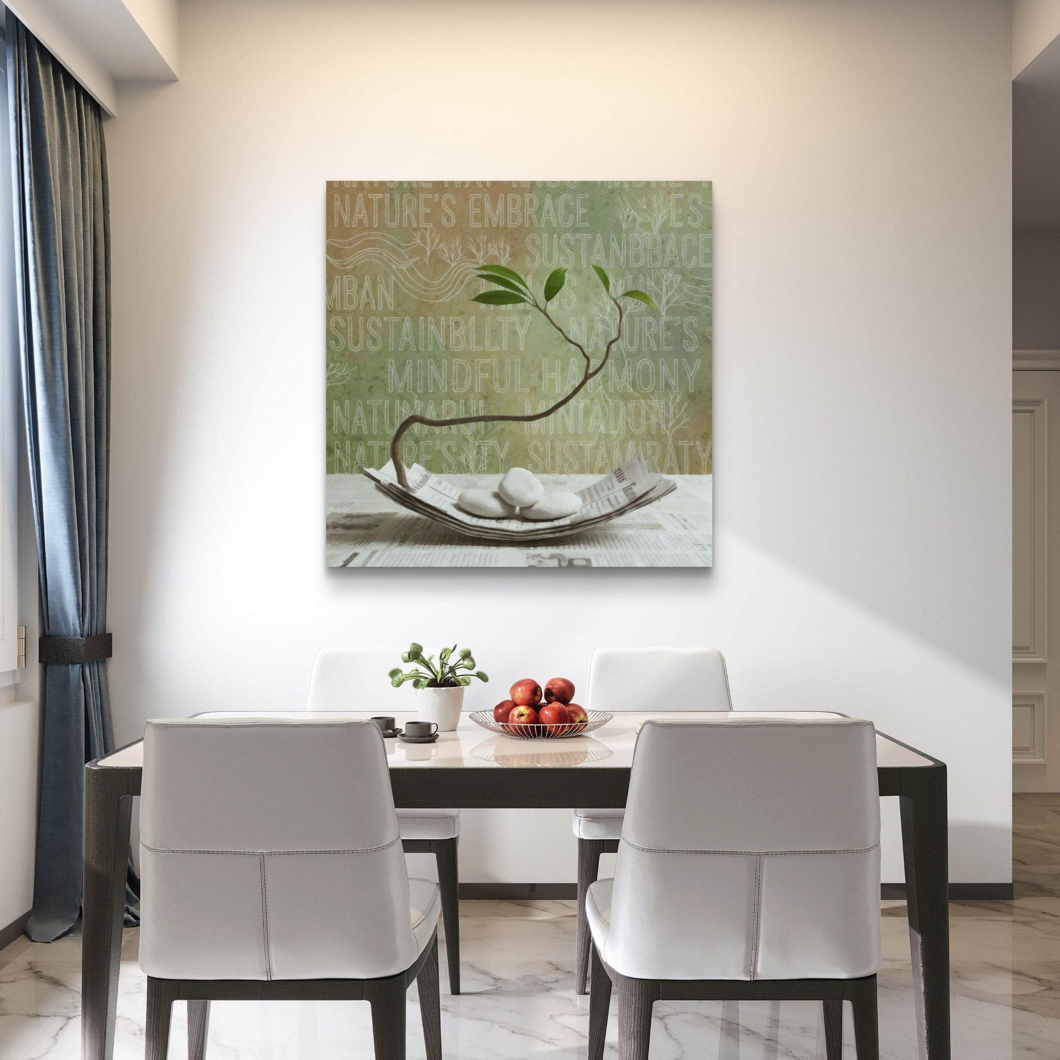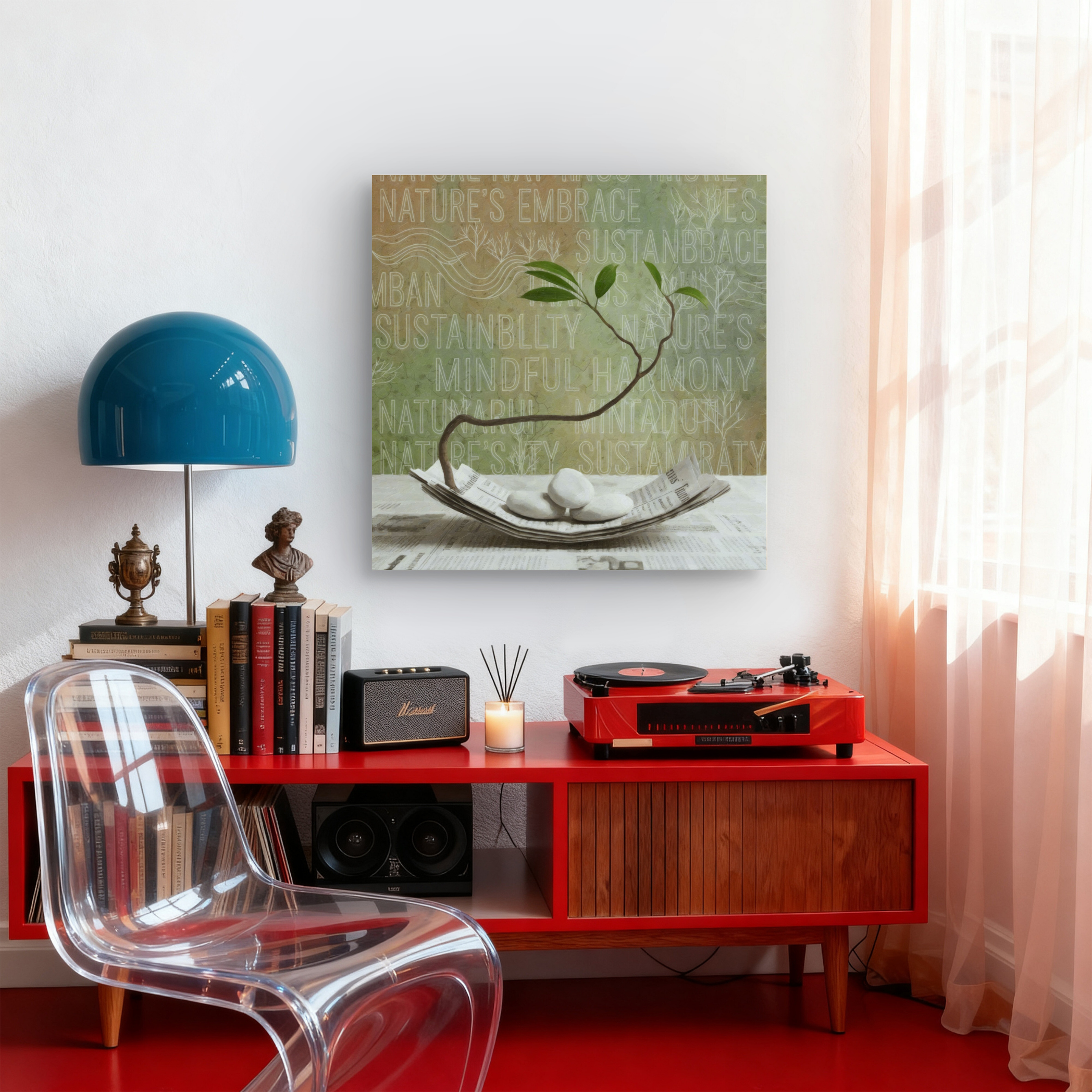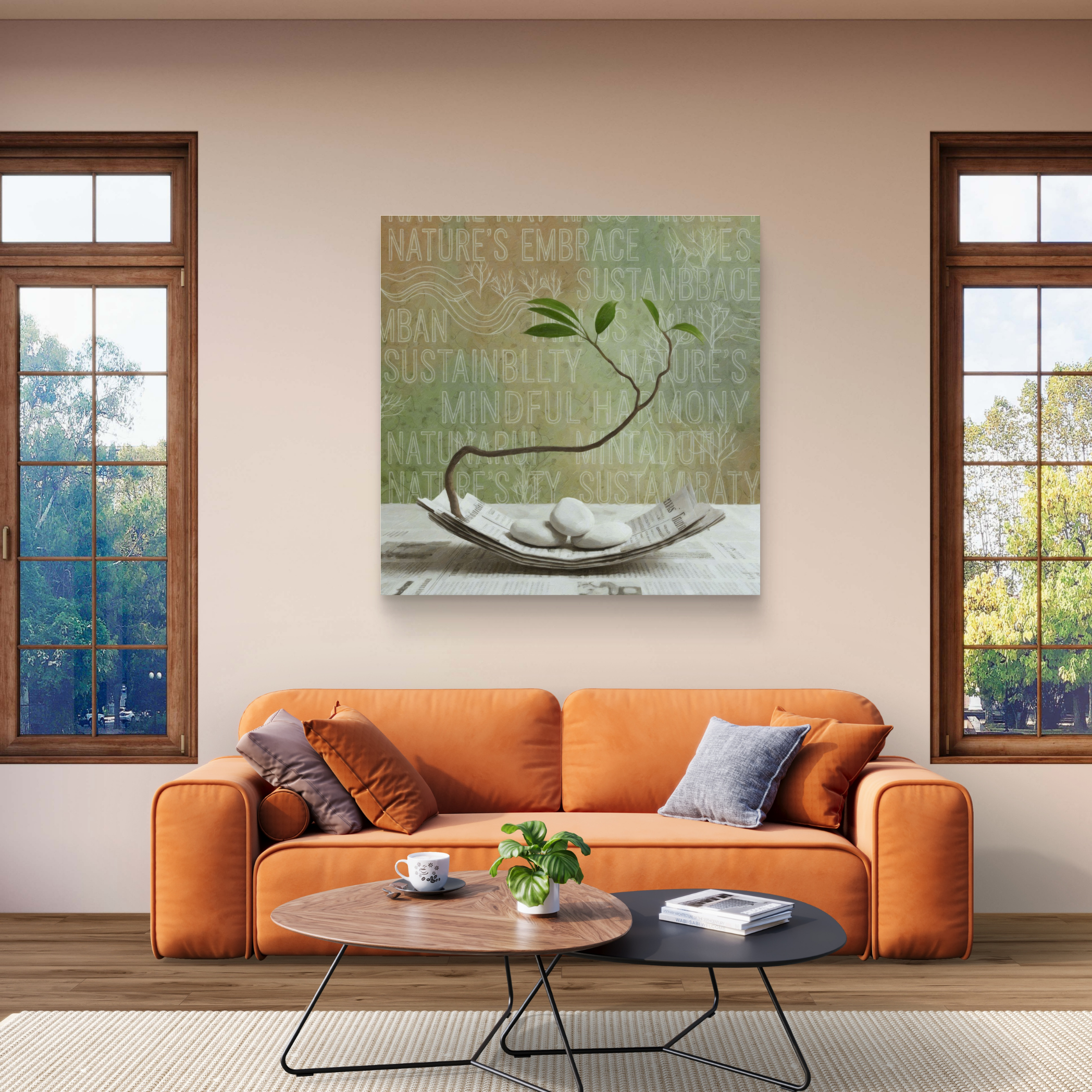 A kép nyugalmat, egyensúlyt és természetközeliséget sugároz. Ideális azoknak, akik a mindfulness és a sustainable lifestyle (fenntartható életmód) hívei, vagy akik egy modern, mégis természetközeli otthont szeretnének teremtni.
