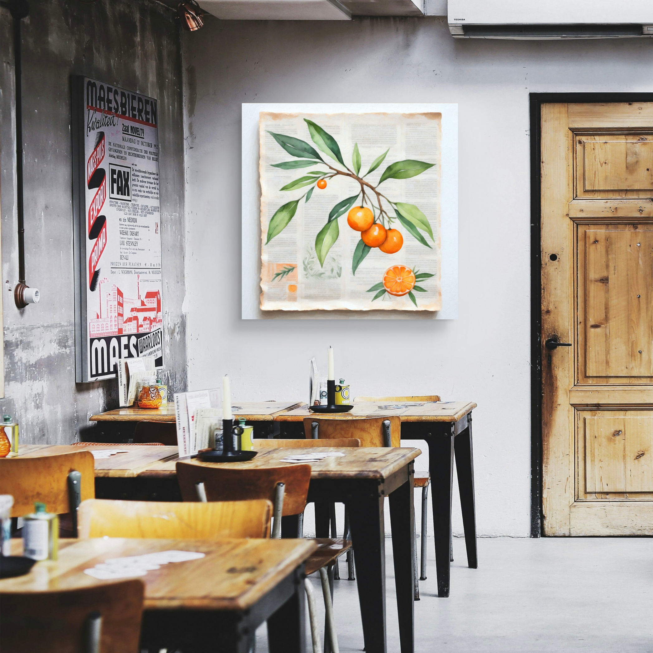 Fedezd fel a „Narancsösztön” című, friss és inspiráló művészi alkotásunkat, amely egy narancságat és narancsokat ábrázol egy régi újságpapír háttéren! Ez a kép a kulturális fúzió jegyében készült, és a természet adottságainak, az életörömnek és a fenntarthatóság üzenetét hordozza. A zöld levelek és az élénk narancsszínű gyümölcsök a természet szépségére, az érettségre és az élet gazdagságára emlékeztetnek.