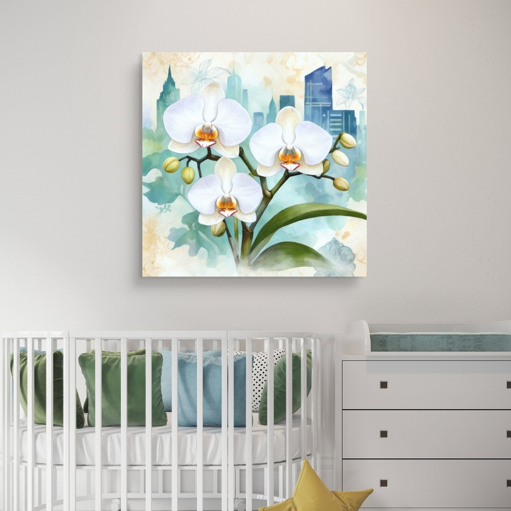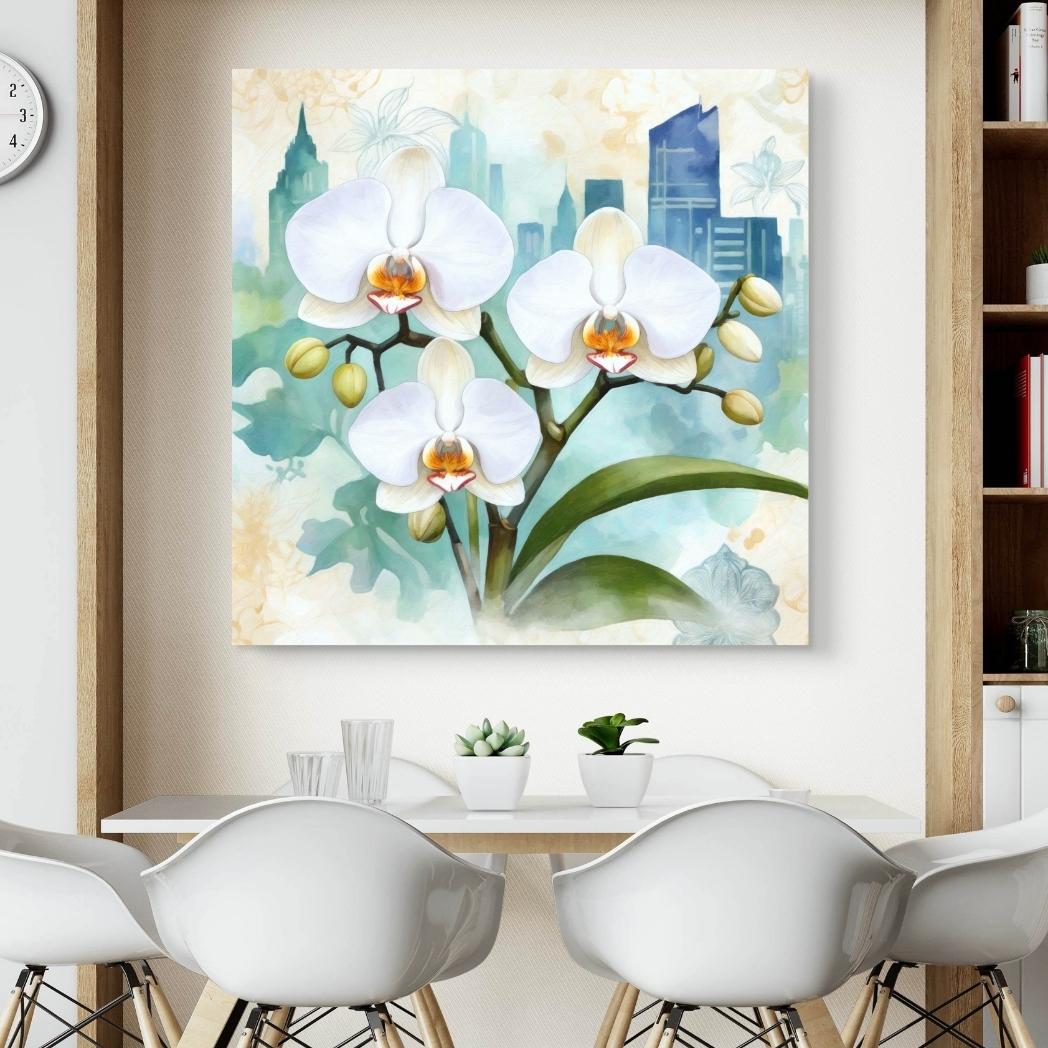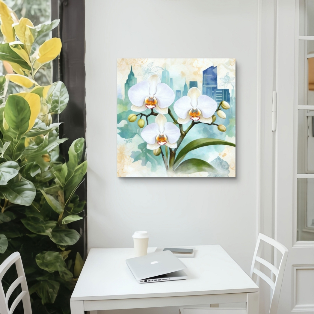 Fedezd fel a „Városi Orchidea” című, elegáns és modern hangulatú művészi alkotásunkat, amely fehér orchideavirágokat ábrázol egy városi panoráma háttérében! Ez a kép a kulturális fúzió jegyében készült, és a természet és város harmóniája, a nyugalom és a fenntartható szépség üzenetét hordozza.